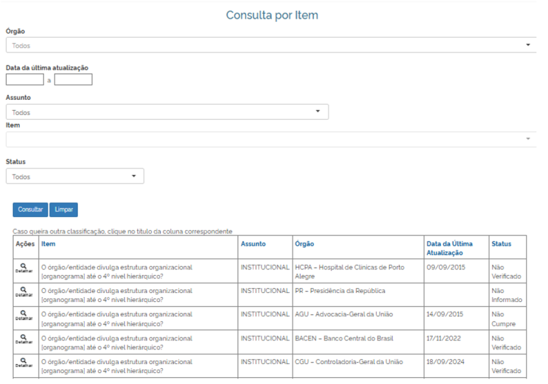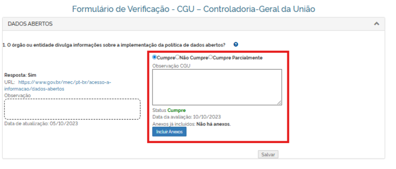 O órgão ou entidade deve responder o item e caso marque ‘Sim’, é necessário informar o link exato de onde está a informação no seu site. Se o mesmo estiver quebrado ou a informação não estiver no local indicado, a CGU não irá avaliar o item como cumprido. O sistema também apresenta um texto explicativo que pode ser acessado ao clicar no símbolo “?”. As respostas do formulário serão validadas pela CGU e a informação poderá ser localizada no campo “Status” de cada item. São cinco situações possíveis: