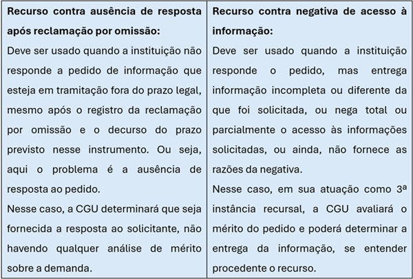 Ressalta-se que o recurso contra ausência de resposta após apresentação de reclamação por omissão não se confunde com o fluxo recursal em face de negativa de acesso ou de não fornecimento das razões da negativa. Entenda a diferença: