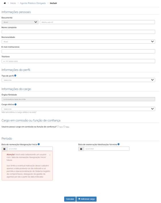 Atenção! Você está cadastrando um usuário com "data de nomeação/designação/início" futura. Isso limita a eventual inativação desse cadastro apenas a data posterior ao dia indicado e só permite a operacionalização do Sistema (registro de compromissos, delegação de gestão de agenda) por ele a partir da data indicada).”