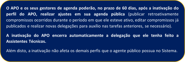 Durante os 60 dias seguintes à data de inativação, o APO e os AIG que sejam seus gestores de agenda poderão publicar retroativamente compromissos ocorridos durante o período em que seu perfil esteve ativo, editar compromissos já publicados e realizar novas delegações para auxílio nas tarefas anteriores, se necessário.