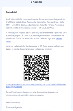 Observação: apenas os participantes que tiverem seus nomes e e-mails inseridos em compromisso previamente agendado receberão mensagem com o link para check-in.