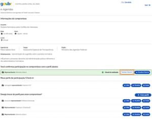 Dentro do e-Agendas, o participante do compromisso poderá cadastrar um novo perfil de participação ou selecionar algum perfil já cadastrado, para em seguida confirmar presença (check-in) naquele compromisso com o perfil escolhido. O check-in poderá ser desfeito pelo participante, na hipótese de equívoco na escolha do perfil de participação.