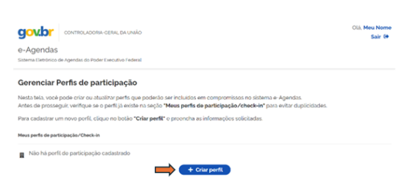 A qualquer momento, os participantes dos compromissos poderão cadastrar perfis de participação para si próprios. Esses perfis permanecem salvos no banco de dados do e-Agendas, e servem para que o criador de um compromisso possa indicar, de forma rápida e fácil, todos os participantes com dados completos e fidedignos.
