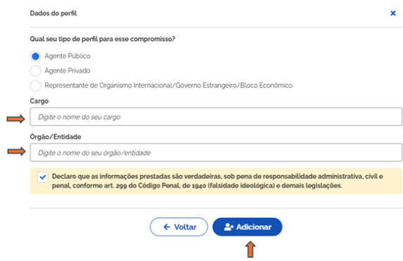- Para todos os perfis, assinale a declaração “Declaro que as informações prestadas são verdadeiras, sob pena de responsabilidade administrativa, civil e penal, conforme art. 299 do Código Penal, de 1940 (falsidade ideológica) e demais legislações.” (Figura 87)