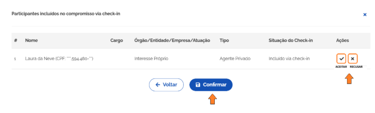 Aceitando ou recusando a participação da pessoa incluída via check- in