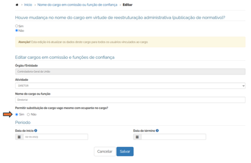 f.       Para a pergunta “Permitir substituição de cargo vago mesmo com ocupante de cargo?”, marque a opção “sim” e salve a alteração (Figura 27).