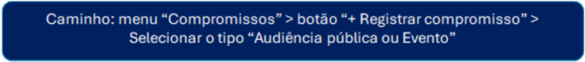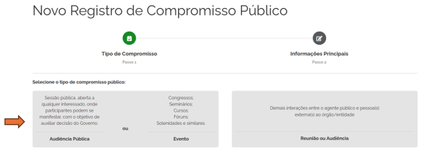 c. Selecione o tipo de compromisso “Audiência Pública ou Evento” entre as opções que são apresentadas na tela inicial do formulário de registro (Figura 40);
